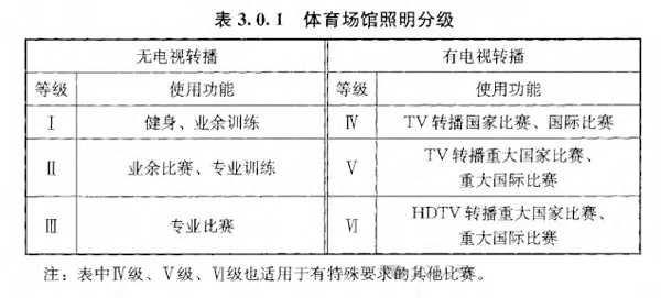 According to *JGJ153-2016 Standard for Lighting Design and Measurement of Sports Venues*, sports venue lighting is classified into six levels based on functional use: