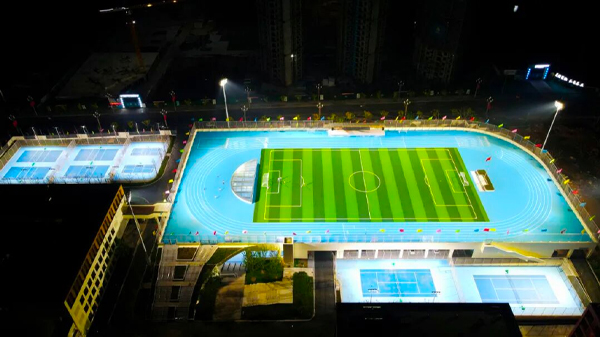 The athletics track at the Tsinghua University High School (Tianfu Campus) is equipped with 15 sets of 1000W stadium lights from SCL; the football field achieves an average horizontal illuminance of 577lux, while the athletics track maintains an average horizontal illuminance of 569lux.