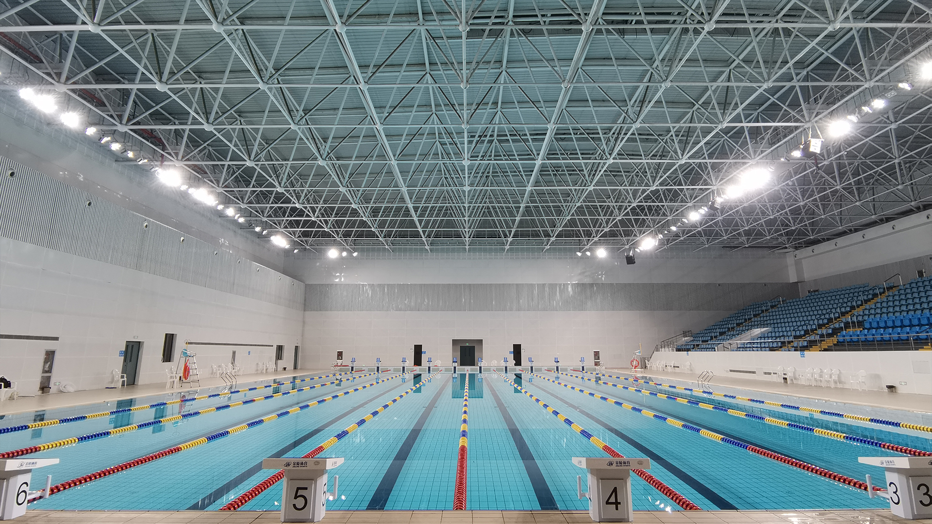 The Swimming Pool of Weishan Sports Center is a key part of the "One Stadium and Three Halls" (including stadium, gymnasium and news & cultural center) of the local sports center. It was designed by China Construction First Group Co., Ltd. (designer of the Water Cube) and managed by CCIEE Engineering Construction Supervision Co., Ltd. (former supervision unit of the Bird's Nest). Construction started in September 2012, the main structure was completed in March 2013, and it was officially finished in 2014.